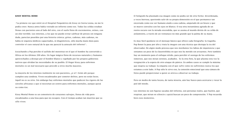 Sierra Leona, Etiopía, Somalia, Darfur, Cuba, Sudáfrica, Zambia, Honduras, Swazilandia, Polonia o Haití, forman un periplo vital en imágenes que hace visible lo que ocurre allí donde sobran las palabras. Son presos del caos, la tortura, las cadenas, la guerra, el sida, el abuso sexual, la locura o la polución. Pero muchas de estas historias ya no son tan trágicas gracias a los que actúan en silencio, como los autores de este libro y además, lo denuncian en voz alta.